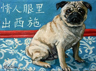 The more I looked at my Pug and Bust, the more it seemed as if the pug’s butt was glued to the base of the statue. I had to change it! So here is the new version. The Chinese Characters on the wall actually read, “Beauty is in the Eye of the Beholder,” and the pug seems to be begging the question…..Who is the Beholder in this relationship, you or me?
