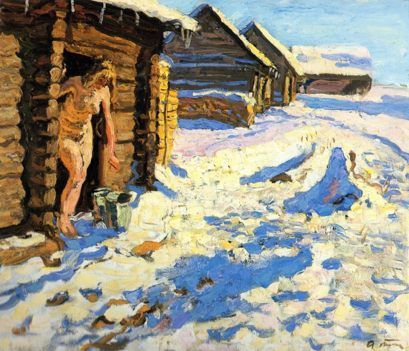 Alexei Trachev ← Previous Next → Bath House by Alexei Trachev nude woman, sauna, sauna in snow, Russian Impressionist Art, Alexei Trachev