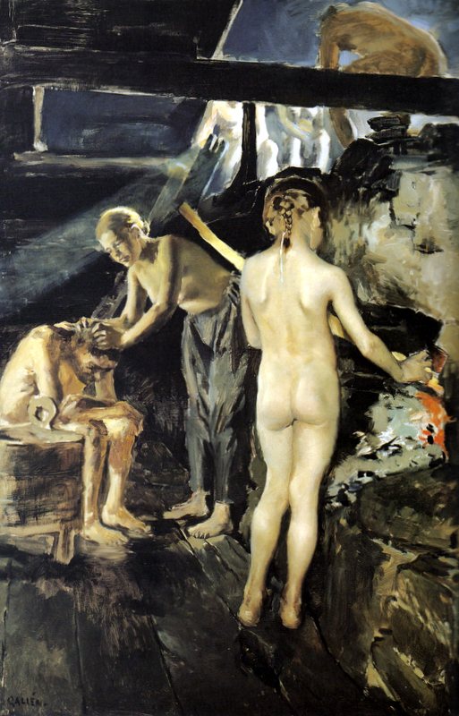 img187 ← Previous Next → In the Sauna by Akseli Gallen-Kallela smoke sauna, family washing themselves. nude painting, historic sauna