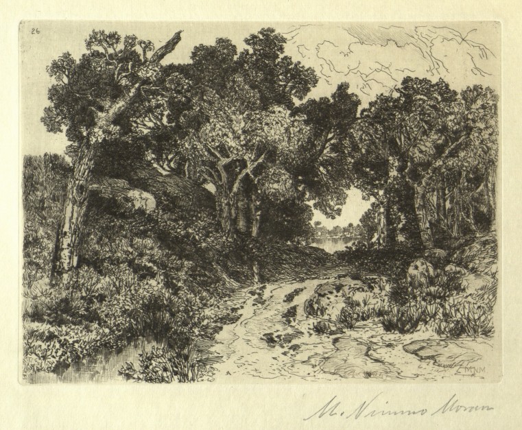 One of the greatest landscape artists of all time, along with Frederic Church and Albert Bierstadt, Moran was instrumental in persuading Congress to establish Yellowstone National Park due to his stunning portrayals of its landscape.  This painting was inspired on a trip to St. Augustine with his wife, Mary Nimmo Moran, who was a first-rate etcher and landscape painter in her own right.  Here is an example of her work: