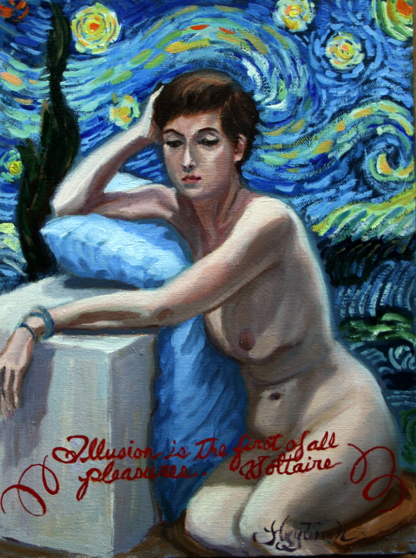 IMG_5217 ← Previous Illusion is the first of all pleasures. Voltaire nude study with Van Gogh’s Starry Night, Voltaire quote, female nude oil painting, nude with Starry Starry Night