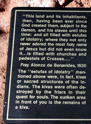 The Jemez people living at Giusewa were asked — nicely, I wonder? — to convert to Catholicism, but were not much interested. I read (I think) that the mission church and convent were built with the help of Catholic converts from the Chaco Canyon pueblo rather than Jemez, but don’t quote me. (I had to photograph the plaque above. The missionaries found crosses, a very popular pagan symbol for millenia, everywhere amongst the native pueblo dwellers.) San Jose de los Jemez was burned and the pueblo was abandoned for some time. It was later re-occupied, but was abandoned for good by the Jemez by 1700. In 1680, all the Pueblo peoples of New Mexico united and drove the Spaniards completely out of New Mexico. In 1692, the Spaniards came back and easily reconquered the Natives because of their lack of unity. In 1706 the Jemez people rebuilt an old village of theirs further down Jemez Canyon, which became the village known today as Jemez Pueblo, or Walatowa in the native language.