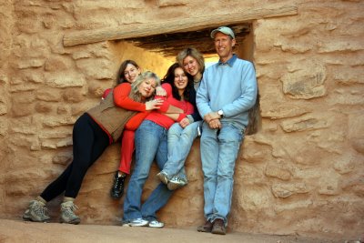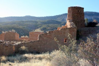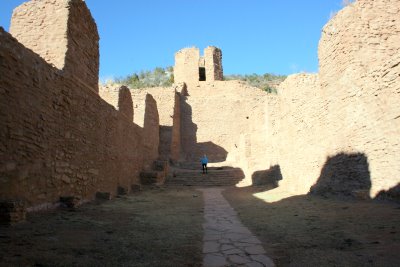 After we’d taken a hike up the Frijoles Canyon, amidst Ponderosa Pines and along a narrow, but constant stream, we drove to our next stop, Jémez State Monument, which preserves ruins of the 700-year-old Giusewa Pueblo, an ancestral home of today’s Jemez Pueblo and of the San José de los Jémez Mission church, built like a fortress in 1621 by the Spanish. Again, wow! Its octagon-shaped bell tower and eight-foot-thick walls were constructed by persons with no formal training in architecture or building. It is the second — only the second –oldest church in New Mexico. I hadn’t known that the Spanish colonized a part of the later United States permanently so early in the 17th Century. This is a whole new period of history for me to read about.