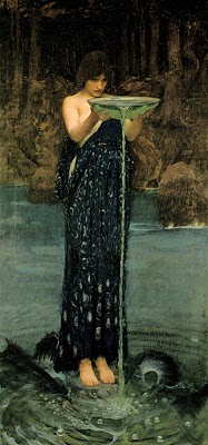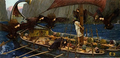 Apparently, in the Odyssey, there are only two Sirens. Waterhouse provides seven. Sirens are portrayed this way in Greek Vase Paintings, with women’s heads (All the better to sing, my dear) and bird’s bodies. I have always pictured them as mermaids of one sort or another, as Waterhouse does in a later painting. I love the Greek Ship and the Clashing Rocks though.